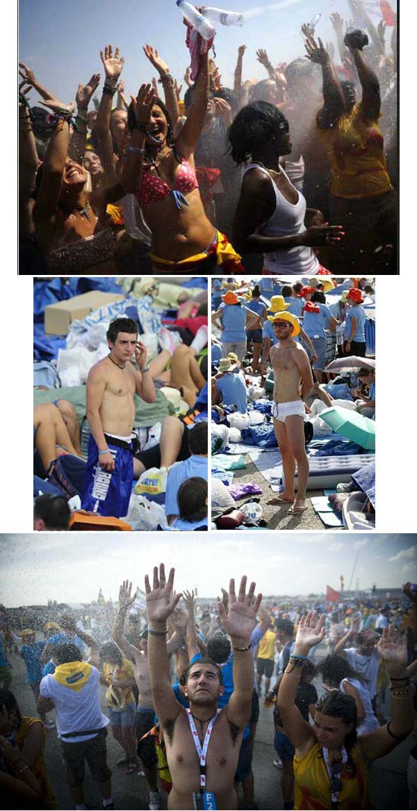 Quando quase tudo convida à sensualidade e quase nada impede as coisas de alcançar seus últimos estágios, não é necessário ser muito inteligente para concluir que aquelas conseqüências finais aconteceram. As fotos ousadas mostradas aqui nos permitem dizer que a atmosfera da JMJ-2011 assemelhava-se a uma enorme orgia. Sua principal diferença é que essa atmosfera tipo bordel na JMJ é abençoada pelas autoridades religiosas e endossada pela presença de Bento XVI.